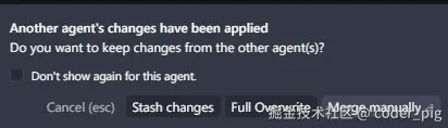 当主目录已经应用过一个 Agent 的改动,当你试图 Apply 另一个 Agent 的改动,会出现下述弹窗:
