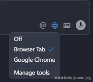 点击 Chat 的网络图标,选中 "Browser Tab ",即可让 AI 在 IDE 内部打开网站、分析网页内容、执行调试,而无需安装额外工具或外部 Chrome: