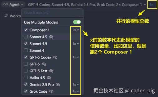 然后,按需选择要 并行启动的模型 (最多8个),同一个模型最多可以选4个,这里我搞了 6个Agent:
