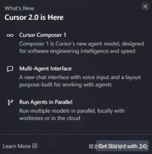 😄 早上和往常一样打开 Cursor 准备开始搬砖,提示更新,更完出现一个 "Cursor 2.0 is Here" 的弹窗: