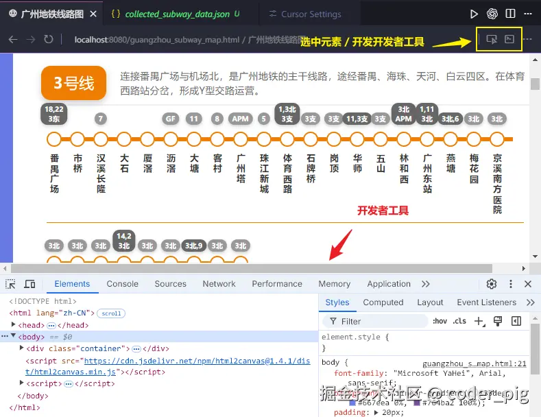 右侧两个功能选项分别是:选中元素 和 开发者工具: