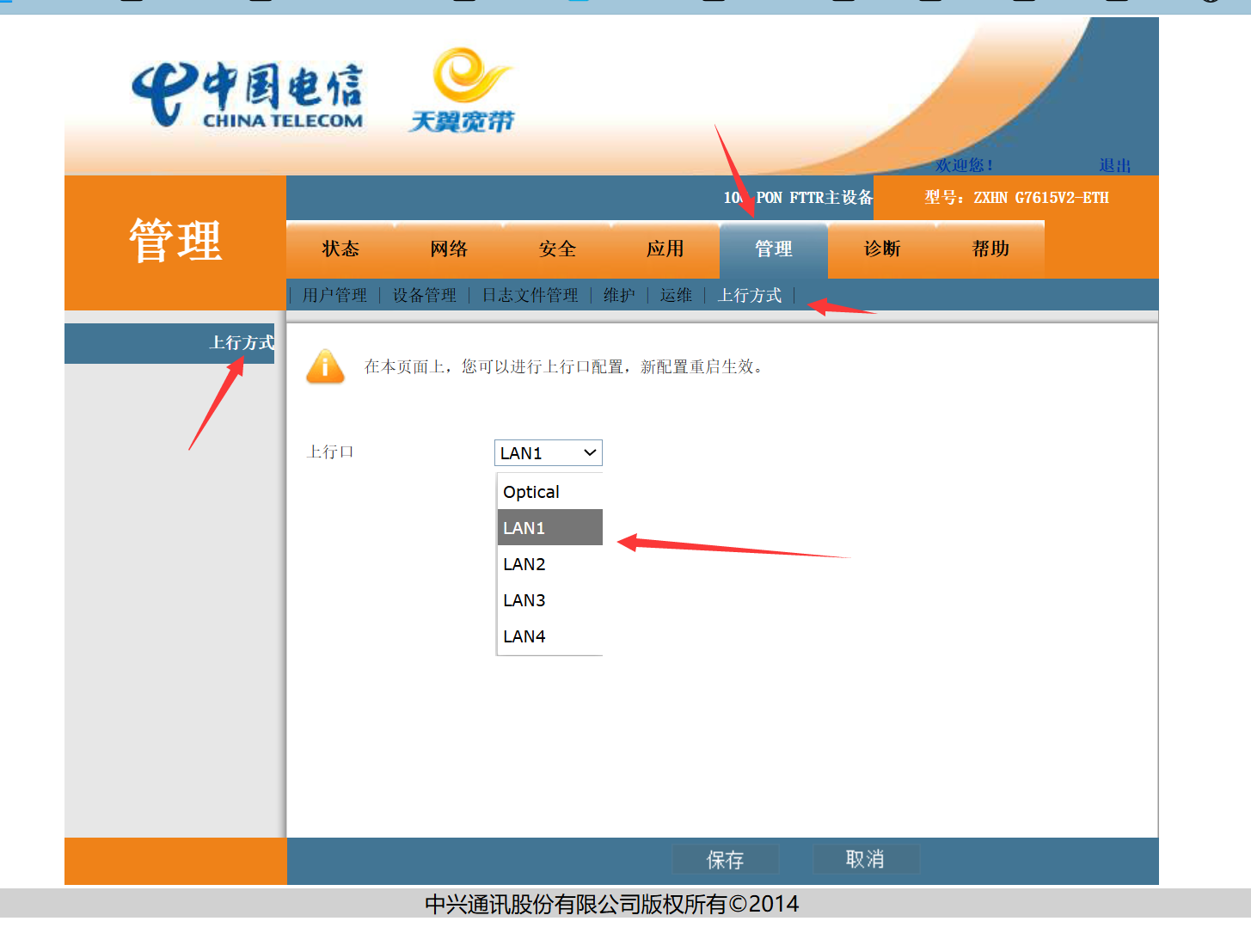 修改网络上行端口为Lan1口: