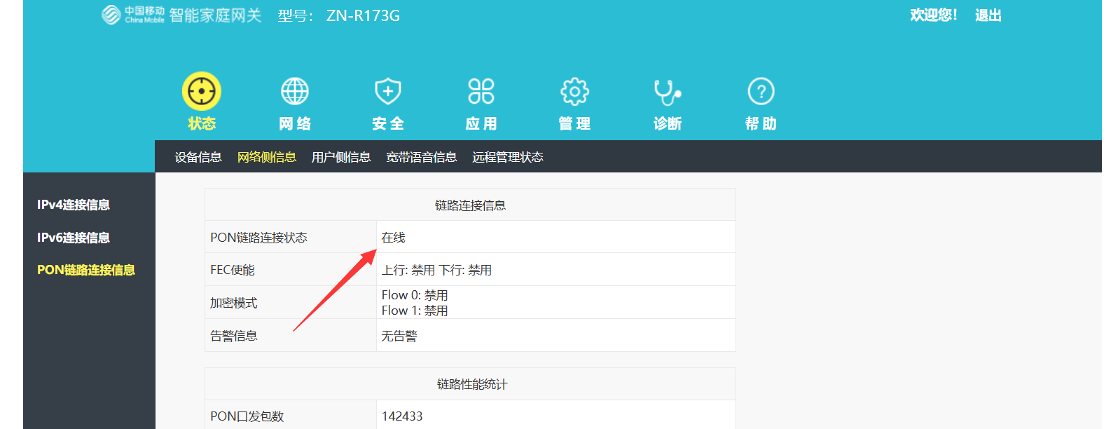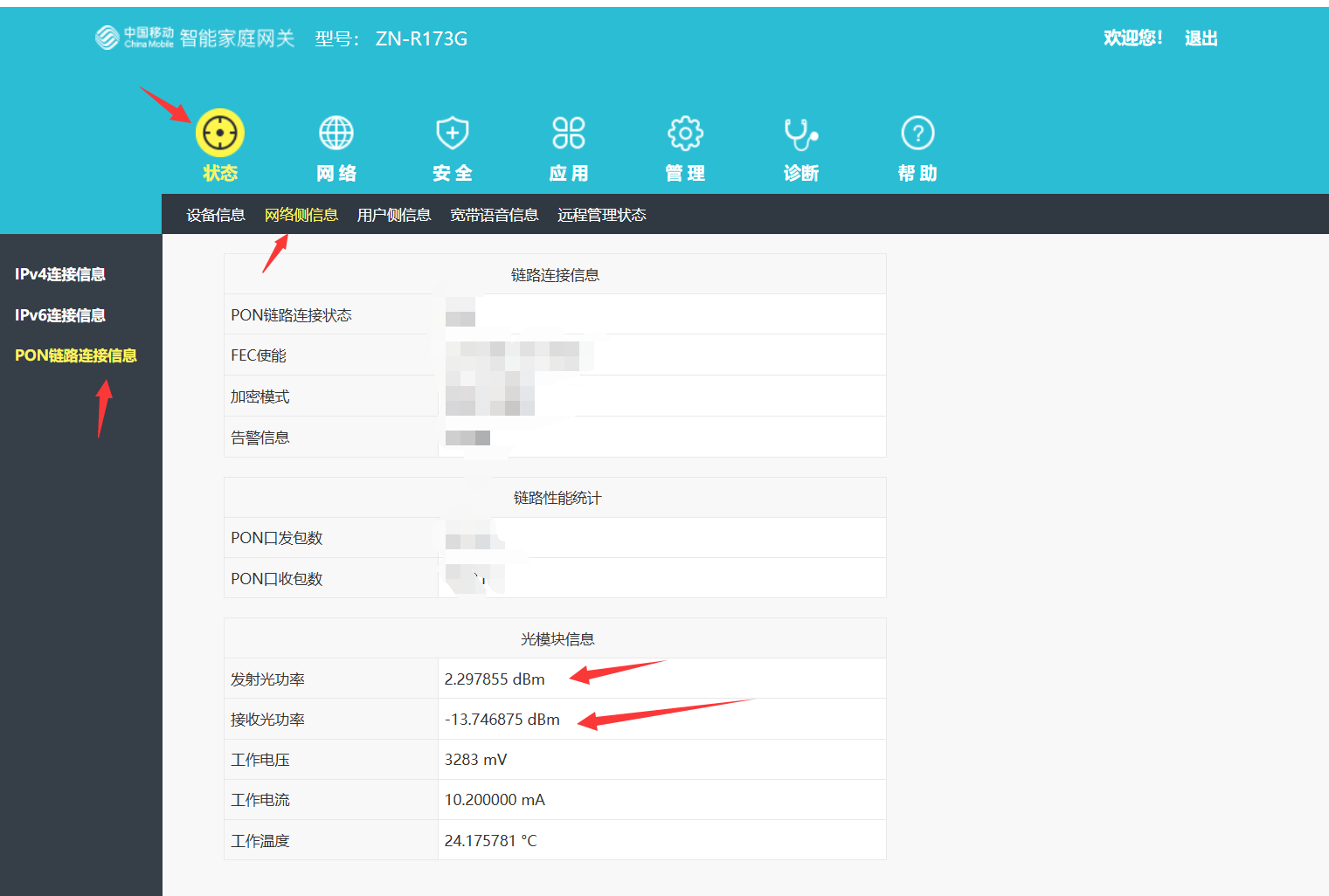 注意,设置三方光猫系统配置需要管理员账号密码,这里不讨论。我这里是ZN-AX173G型号为例子, 连接子光猫了之后,在这里可以看见信号强度,接受光必须在-8到-25中间。