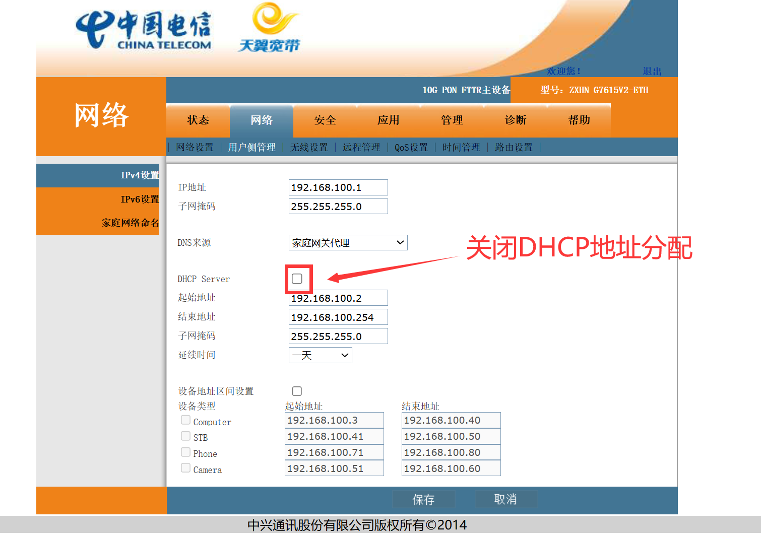 然后地址分配关闭,由上级路由器下发管理,以后登录这个后台,通过图片里面192.168.100.1访问,这个是桥接模式,我尝试了路由模式也可以正常上网,按自己需求修改。