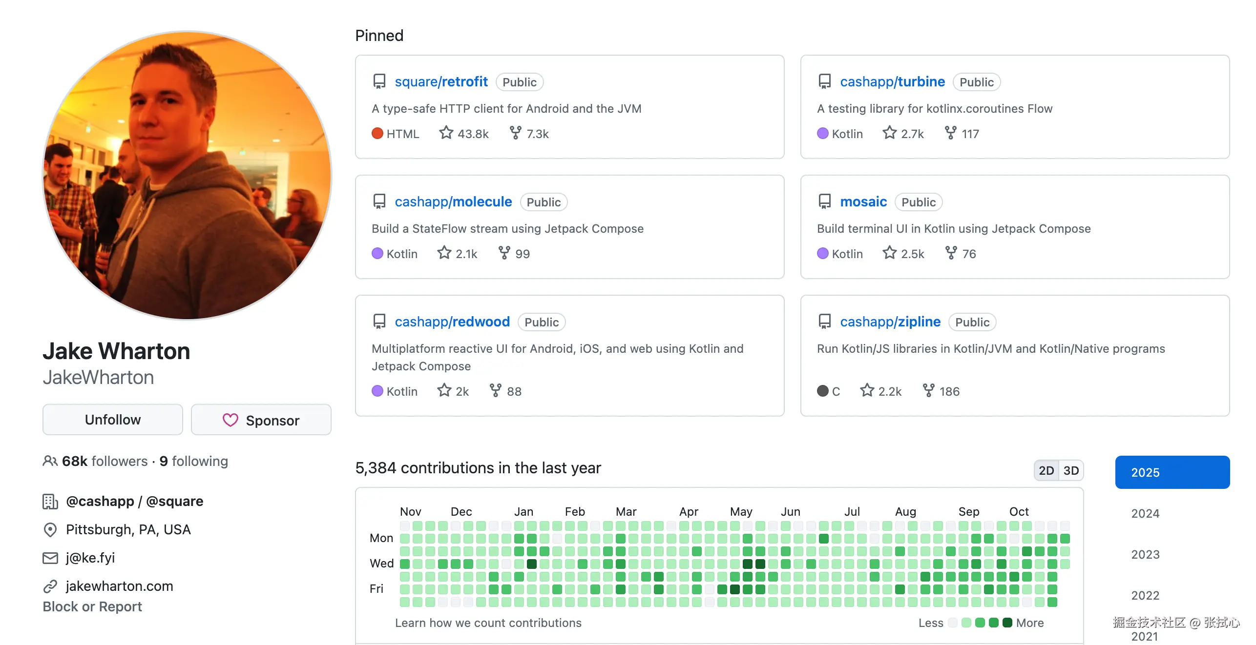- 2012 年就加入 Square,主导 Retrofit、OkHttp、Picasso、Moshi 等底层库,国内几乎每款 App 都在间接调用他的代码