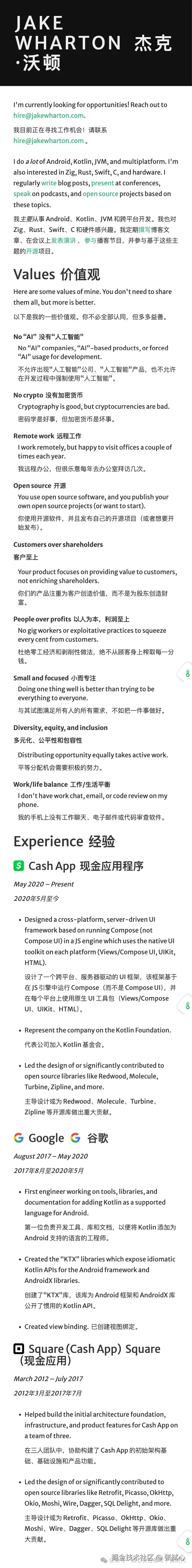 最近 Jake Wharton(Android 世界最知名的贡献者之一)在个人网站(jakewharton.com/hire/) 声明开始看工作机会: