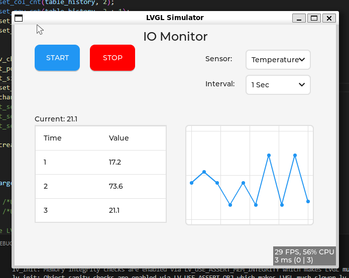 模拟使用2寸以内的LCD。包含控制和显示两个部分。控制包括启动,停止,传感器选择(下拉选择),采样间隔(秒)。显示包括当前数值,列表显示最近6个时间周期的,然后一个折线图,也是显示最近6个