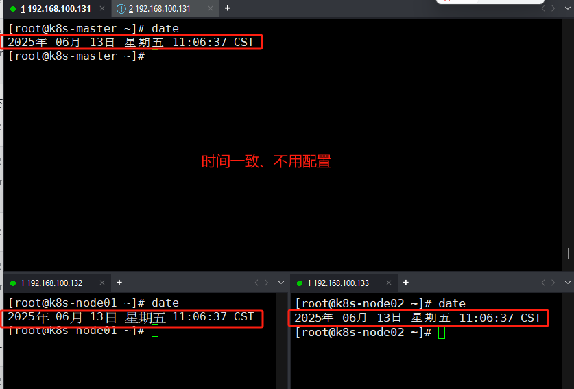 在master节点上输入date命令,可以查看到当前系统时间如下所示。