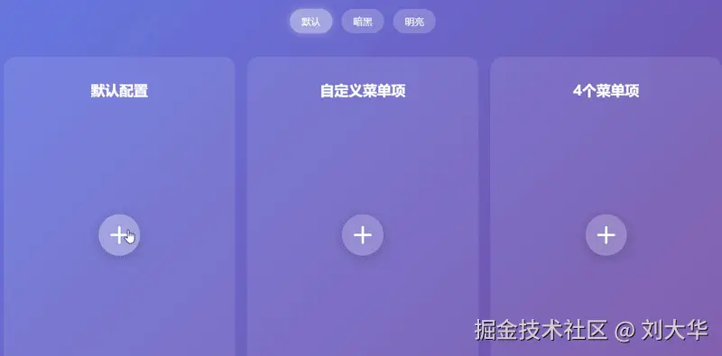 实现的效果: 1、圆形展开动画 :点击中心按钮,菜单项会以圆形轨迹展开 2、多种主题 :支持默认、暗黑、明亮三种主题风格 3、完全可定制 :菜单项数量、大小、半径都可以自定义 4、平滑动画 :使用贝塞尔曲线实现流畅的展开/收起动画 5、悬停提示:鼠标悬停显示功能提示
