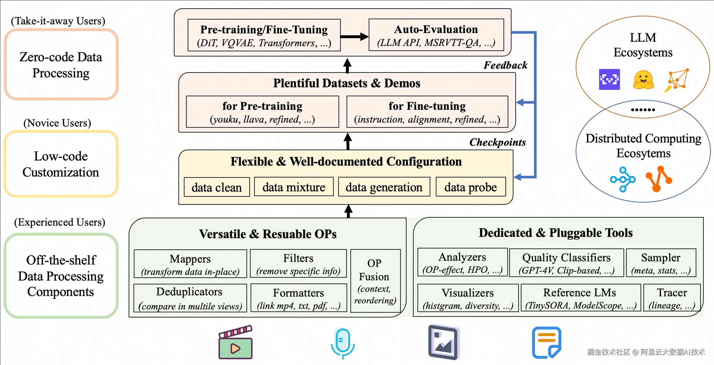 多模态协同处理引擎:内置文本、图像、视频、音频等专用算子,支持视觉-文本-时序数据的联合清洗与增强,避免传统工具链的"碎片化"处理。