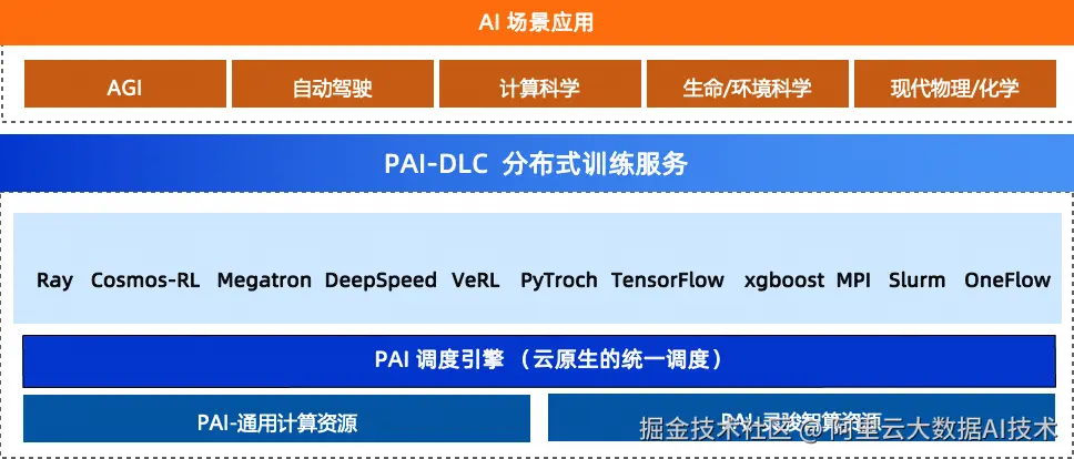 PAI-DLC是阿里云人工智能平台PAI提供的云原生AI分布式训练服务,为开发者和企业提供灵活、稳定、易用和高性能的训练环境, 支持多种AI训练框架,能够处理大规模分布式模型训练任务,在降低成本的同时提升训练效率。