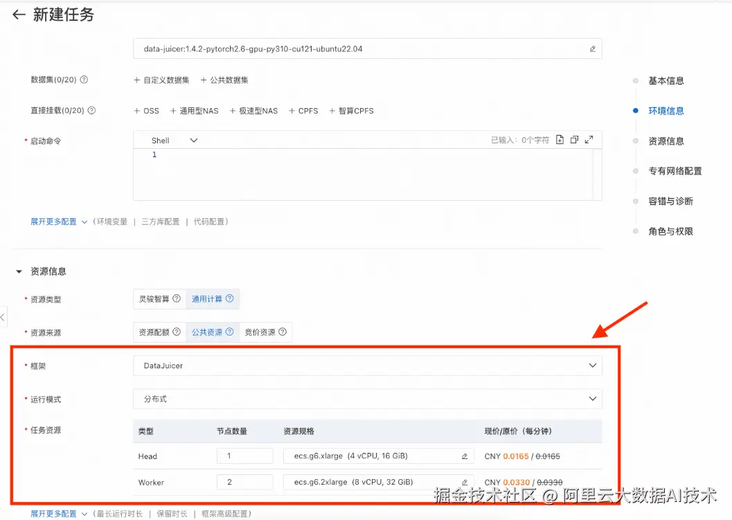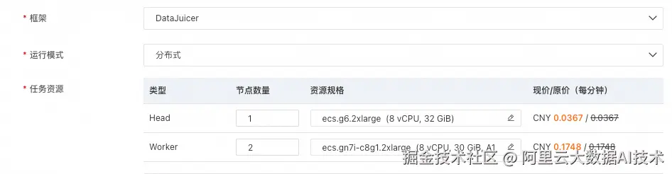 Step3 资源配置: 选择DataJuicer框架,选择分布式的运行模式,并配置如下资源。