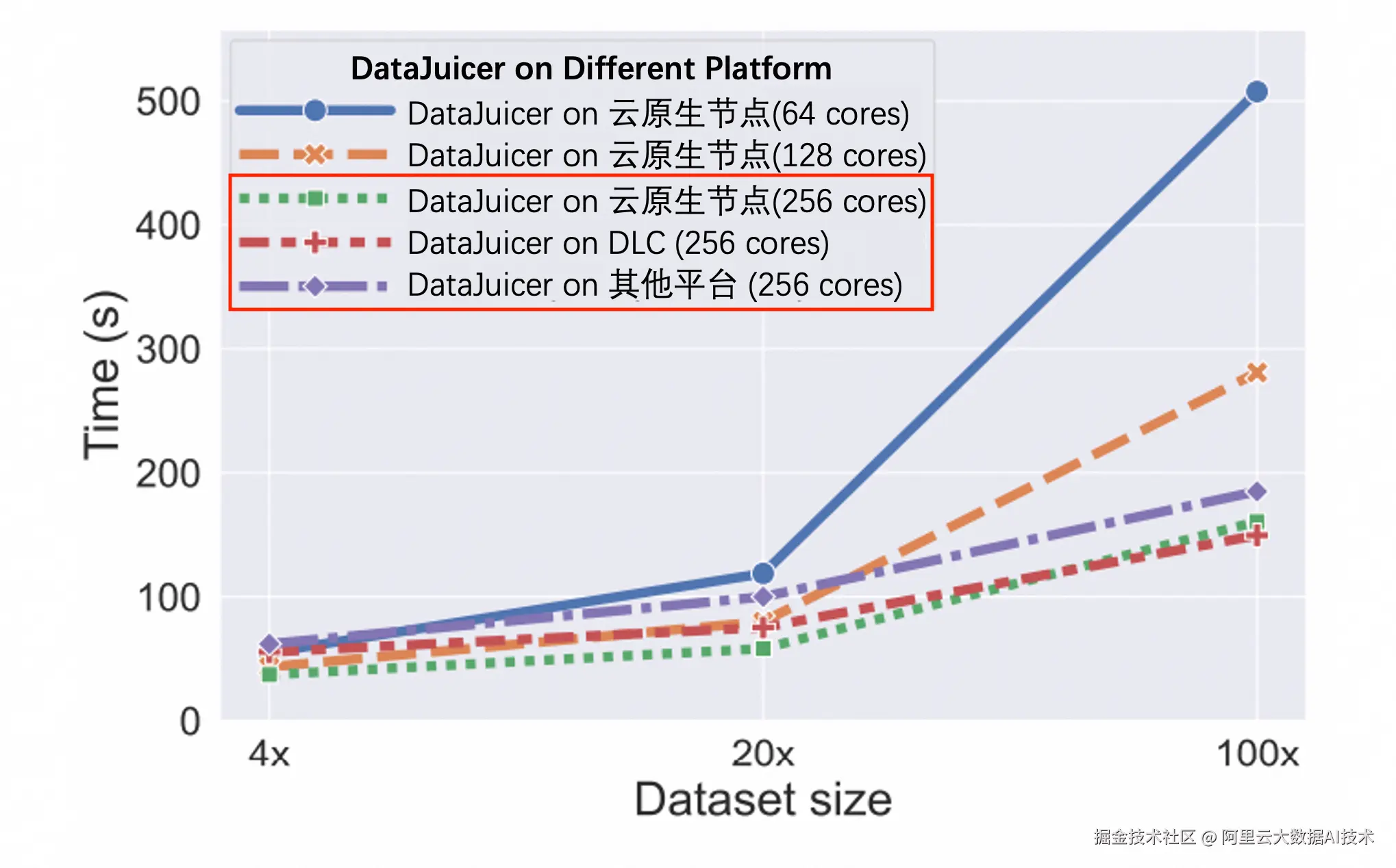 高性能:DataJuicer on DLC 在千万级多模态数据集的处理中,展现出卓越的线性扩展性能,和数据处理速度优势,有效优化资源利用。 -
