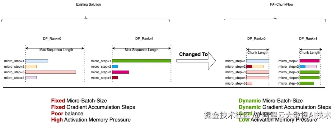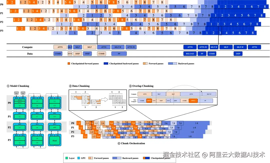 针对大规模 MoE 模型,PAI 提供 paiMoE 引擎。paiMoE 核心技术含 MoE 高性能训练优化 Tangram 和 长序列训练优化 ChunkFlow,通过统一调度机制、自适应计算通信掩盖、EP计算负载均衡和计算显存分离式并行等方面深度优化,有效解决工作负载不同、稀疏 MoE 通信占比高等问题,实测达到 Qwen3 训练端到端加速比提效 3 倍。