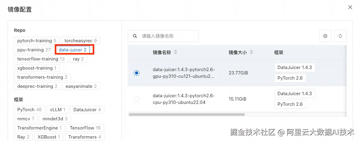 Step2 镜像选择: 选择官方镜像,data-juicer:1.4.3-pytorch2.6-gpu-py310-cu121-ubuntu22.04。  Step3 资源配置: 选择DataJuicer框架,选择分布式的运行模式,并配置如下资源。