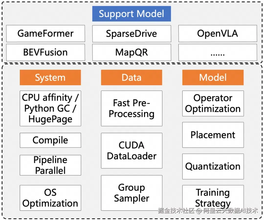 paiTurboX 从系统、数据、模型三个方面针对自动驾驶面临的两大难题进行优化。在系统侧,TurboX 通过优化 CPU 亲和性、流水线并行和动态编译等方案,支持 CPU 计算和 GPU 计算流水并行调度执行,提升模型训练推理效率。