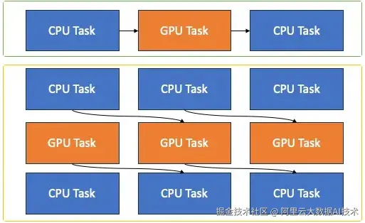支持异构集群: 在海量多模态数据处理场景下,支持不同类型的算子、以及同一个数据处理管线的不同阶段算子,在异构集群(GPU/CPU)分别执行,进一步提升资源利用效率和处理性能