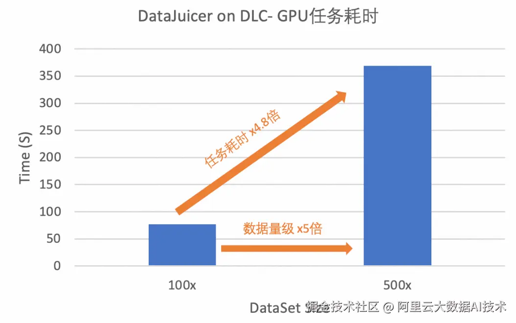 在亿级超大规模数据处理场景, DataJuicer on DLC 呈现出显著的线性加速比与可扩展性。GPU资源配置相同情况下,当数据集扩展至5倍时,数据处理耗时约扩展4.8倍,其线性效率高达96%,最大化GPU资源利用率。