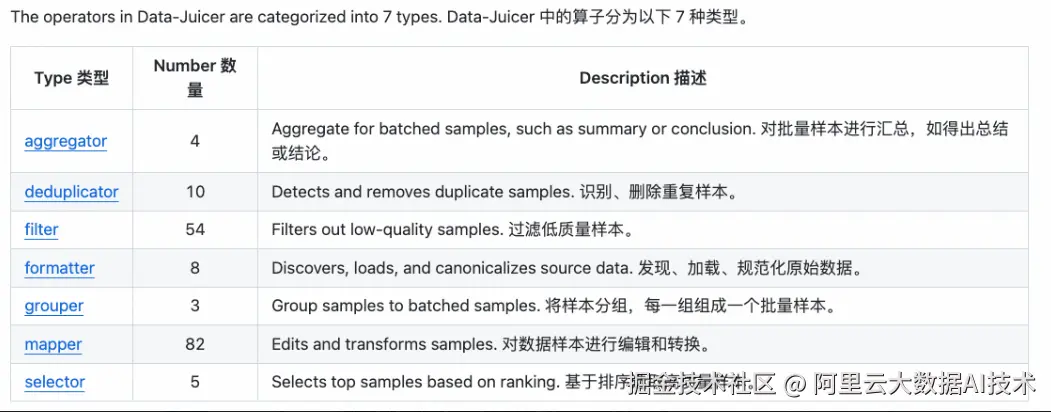 算子丰富: 为用户提供 100 多个核心算子,包含 aggregator、deduplicator、filter、formatter、grouper、mapper、selector 等, 覆盖了数据加载和规范化,数据编辑和转换,数据过滤和去重,及高质量样本筛选的数据处理全周期。