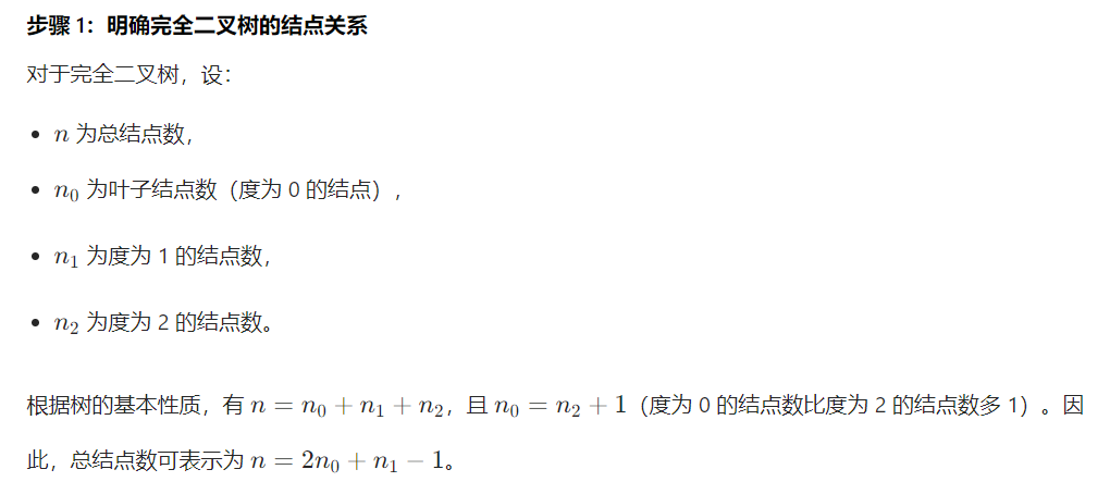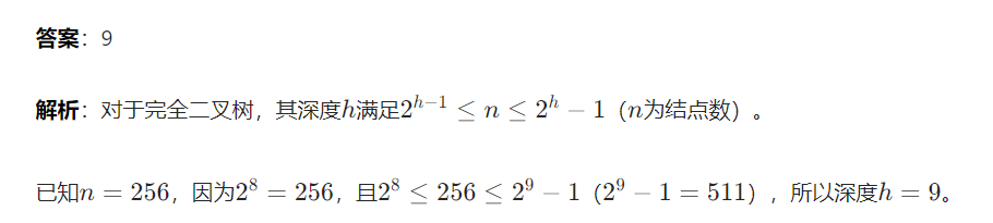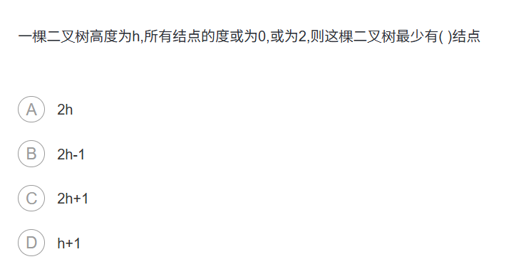 解析:要使结点数最少,需让二叉树每一层的结点尽可能少。因为所有结点的度为 0 或 2,所以第 1 层有 1 个结点(根结点),第 2 层有 2 个结点(根的两个子结点),第 3 层有 2 个结点(第 2 层每个结点的两个子结点)...... 以此类推,第h层有 2 个结点。这是一个等差数列,首项为 1,公差为 1,项数为h,但实际计算时,结点数为\(2h - 1\)。例如,当\(h = 1\)时,结点数为 1,代入\(2h - 1 = 1\),符合;当\(h = 2\)时,结点数为 3,代入\(2h - 1 = 3\),符合。