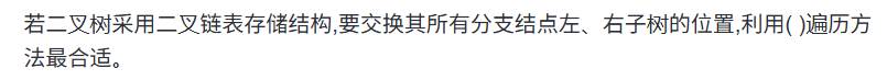 解析:要交换所有分支结点的左、右子树,需先处理左子树,再处理右子树,最后处理当前结点(交换左、右子树)。后序遍历的顺序是 "左子树→右子树→根结点",符合这一处理逻辑,因此利用后序遍历方法最合适。