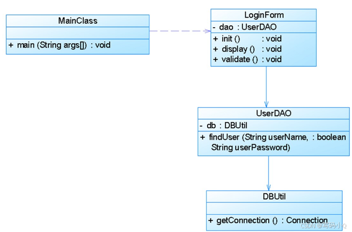 MainClass依赖LoginForm。LoginForm依赖UserDAO。UserDAO依赖DBUtil。这四个类各司其职。