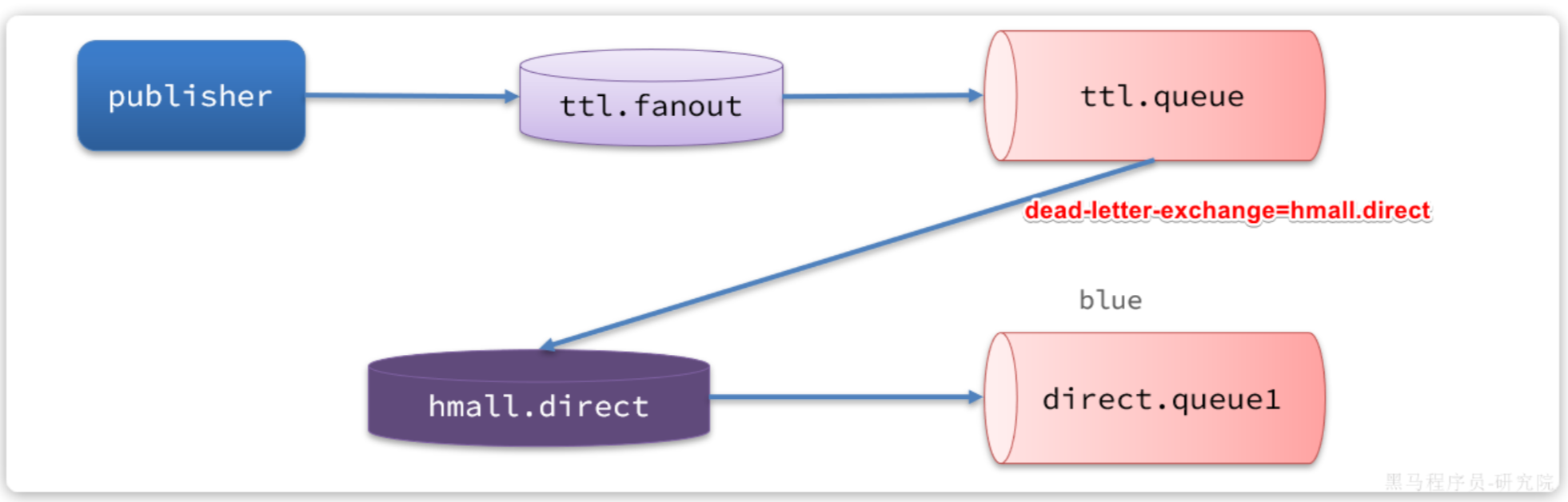 有一组绑定的交换机(ttl.fanout)和队列(ttl.queue)。但是ttl.queue没有消费者监听,而是设定了死信交换机hmall.direct,而队列direct.queue1则与死信交换机绑定,RoutingKey是blue。
