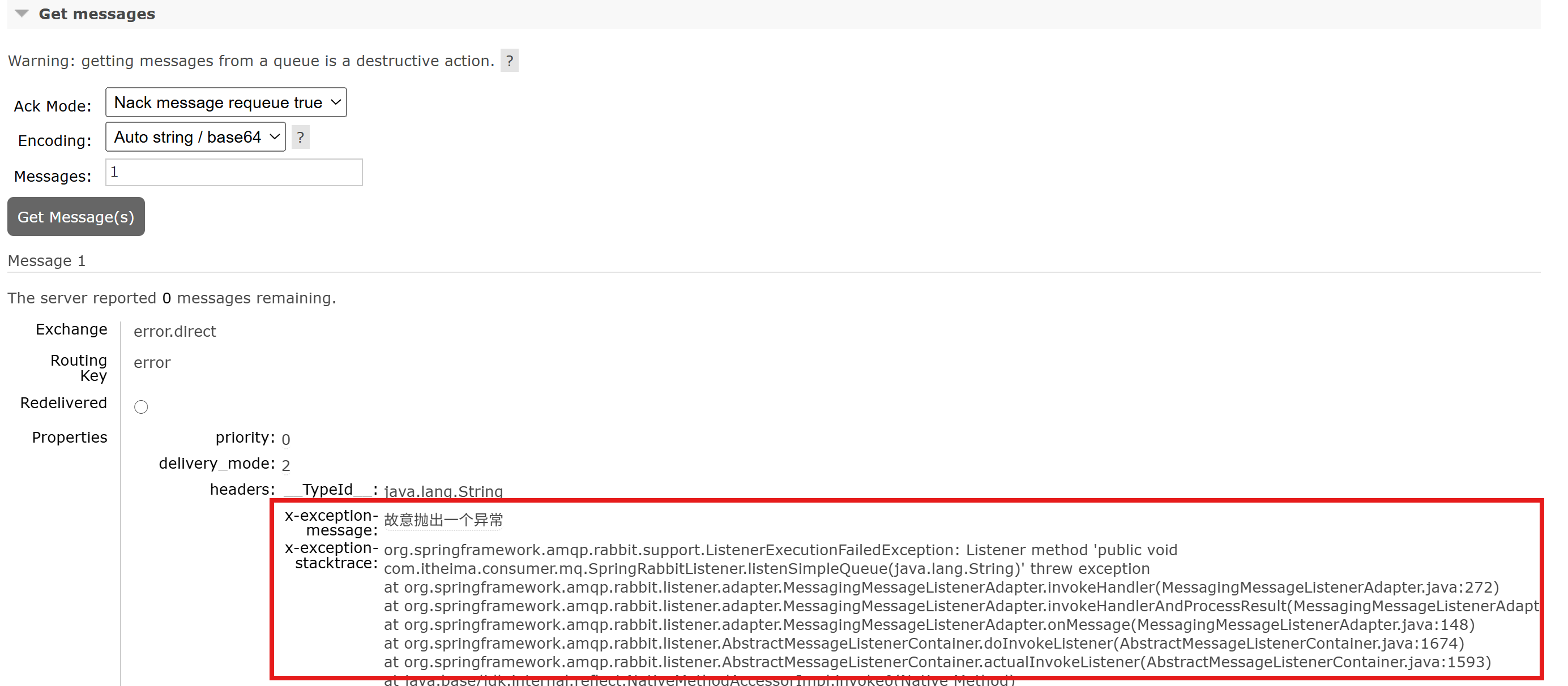 - ImmediateRequeueMessageRecoverer:重试耗尽后,返回nack,消息重新入队
