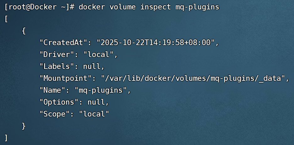 把下载好的文件放入你RabbitMQ挂载的数据卷下查看数据卷:docker volume inspect "你的mq"