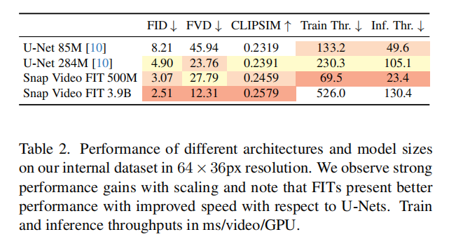 - FIT 架构在相同参数规模下,FID 比 U-Net 低 37%-50%,CLIPSIM 高 2%-7%,运动质量(FVD)提升更显著;