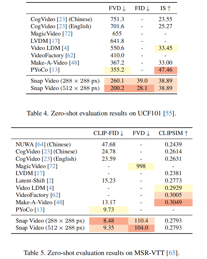 - MSR-VTT:Snap Video 的 CLIP-FID 为 8.48(288×288px),优于 PYoCo(9.73)、Make-A-Video(13.17),CLIPSIM 达 0.2793(文本对齐能力强)。