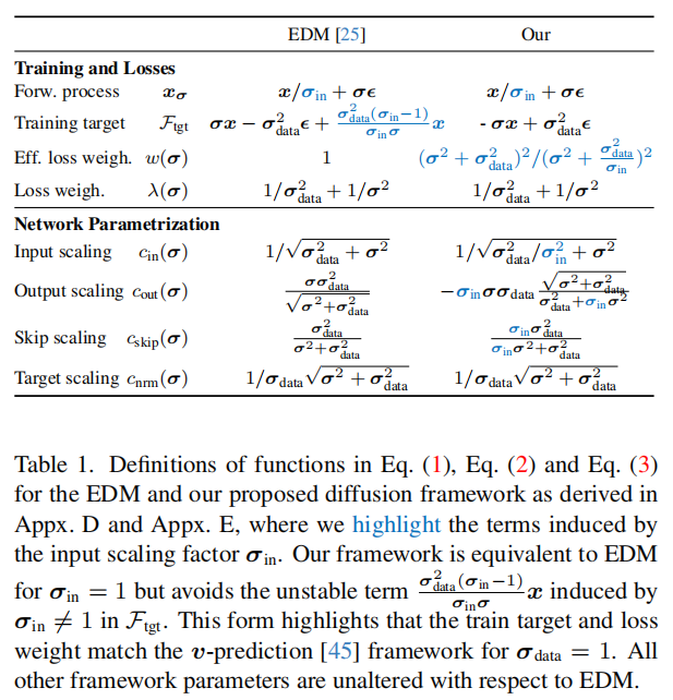 为避免缩放因子引入的目标函数爆炸问题,重构了 EDM 的损失项与网络参数(如输入 / 输出缩放系数、跳跃连接系数)。核心是将训练目标与广泛使用的 v-prediction 框架对齐,确保 时目标函数仍稳定。关键参数定义对比如下表所示: