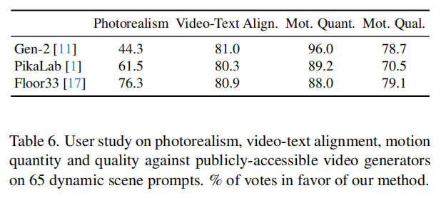 为验证主观质量,对 65 个 "高动态场景" 提示词(如 "沙漠越野车疾驰""太空战舰战斗")生成视频,对比 Snap Video 与 Gen-2、Pika、Floor33,5 名用户对 "照片真实感""文本对齐""运动数量""运动质量" 四项指标投票,结果如下表(表 6):