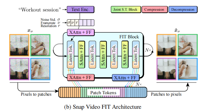 为替代效率低下的 U-Net,Snap Video 基于 FIT(Far-reaching Interleaved Transformers) 设计了高效的时空联合建模架构,核心是通过 "可学习的压缩 latent 表示" 实现时空维度的统一处理,大幅降低计算开销。
