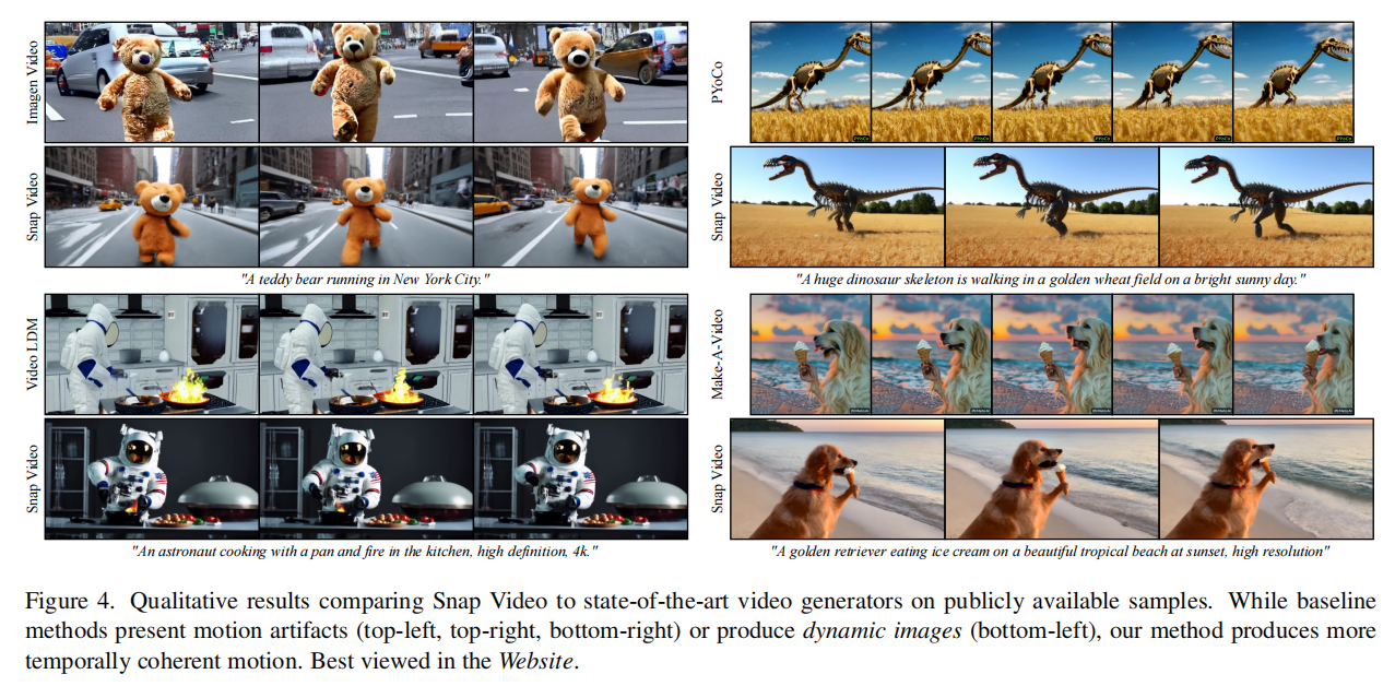 下图(图 4)展示了 Snap Video 与主流方法的定性对比: