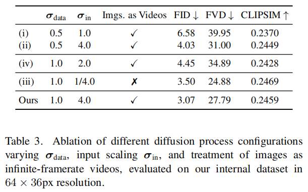 关键结论 :输入缩放 与模态匹配策略共同作用,使 FID 降低 53%、FVD 降低 30%,验证了框架重构的有效性。