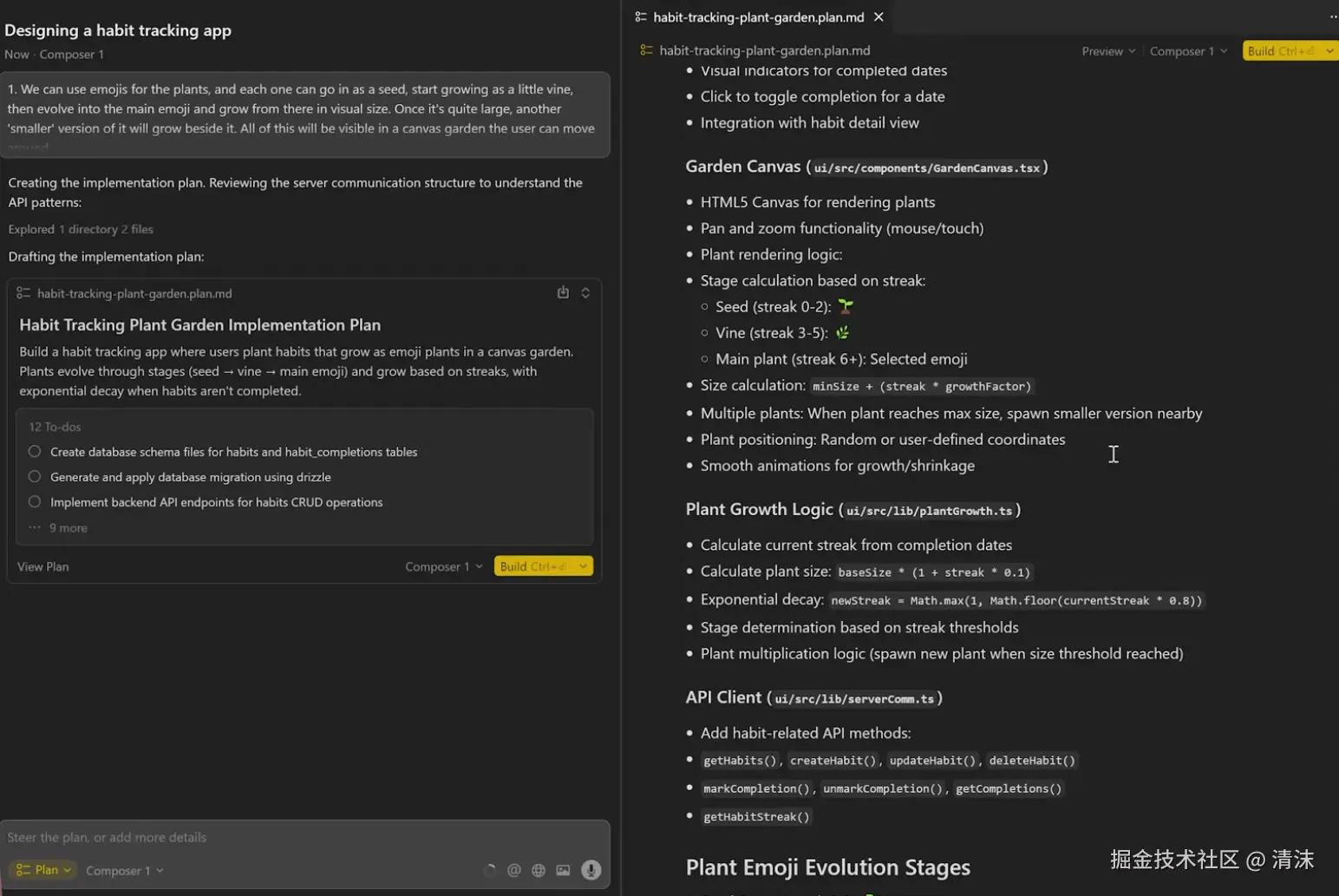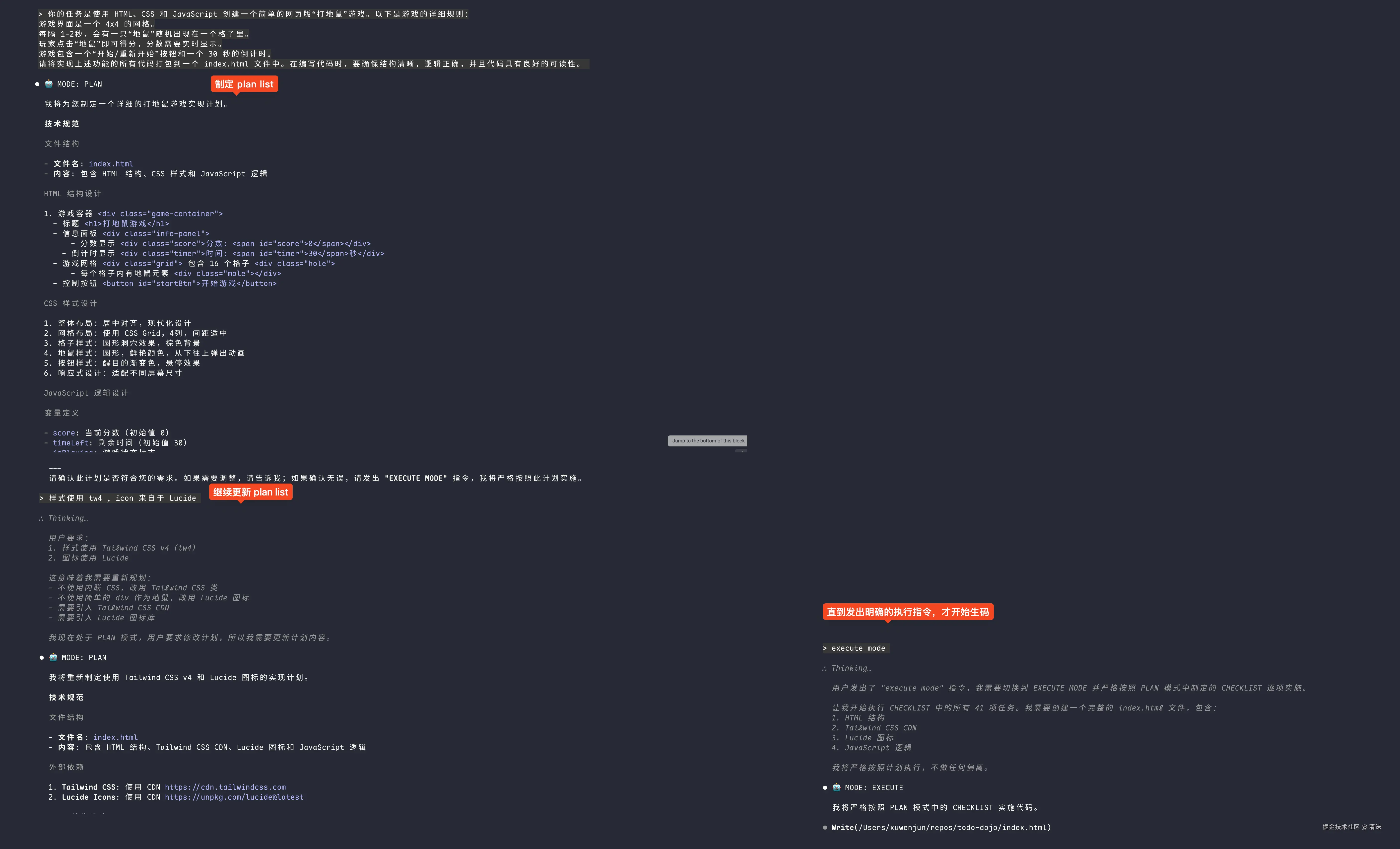 因此,在让 AI 开始干活之前,最好让 AI 先给出一份详细的 todo list 清单。比如 cursor 的 plan 模式和 agent 模式。plan 模式优先和 AI 明确需求方案和实现步骤,再切换到 agent 模式,让 AI 开始干活。绝大多数情况都能保证代码结果符合预期。