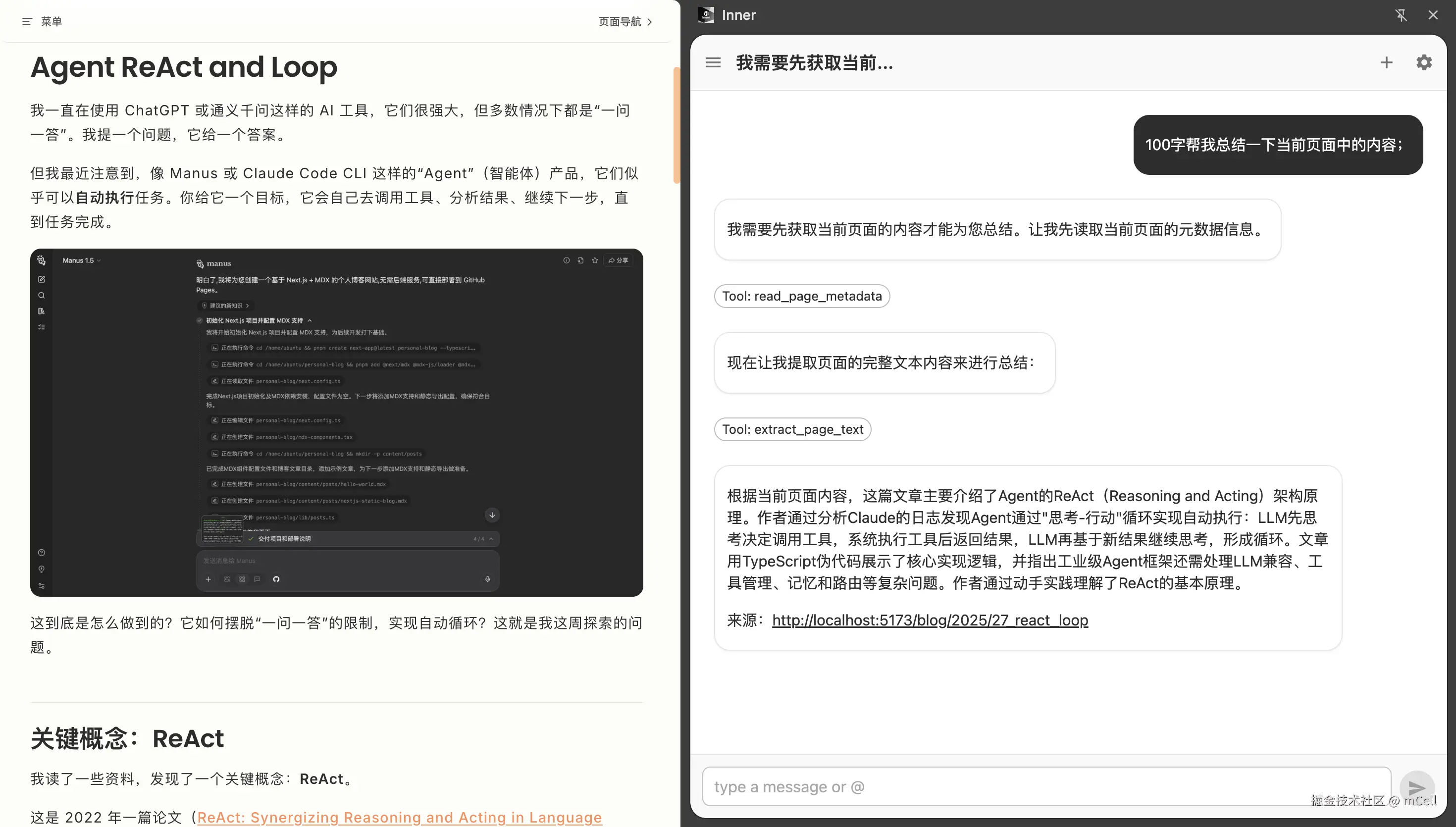 为了快速验证我的想法,我让 Claude Code 基于 Plasmo 快速开发了一个侧边栏形式的 Browser Agent,效果如下:
