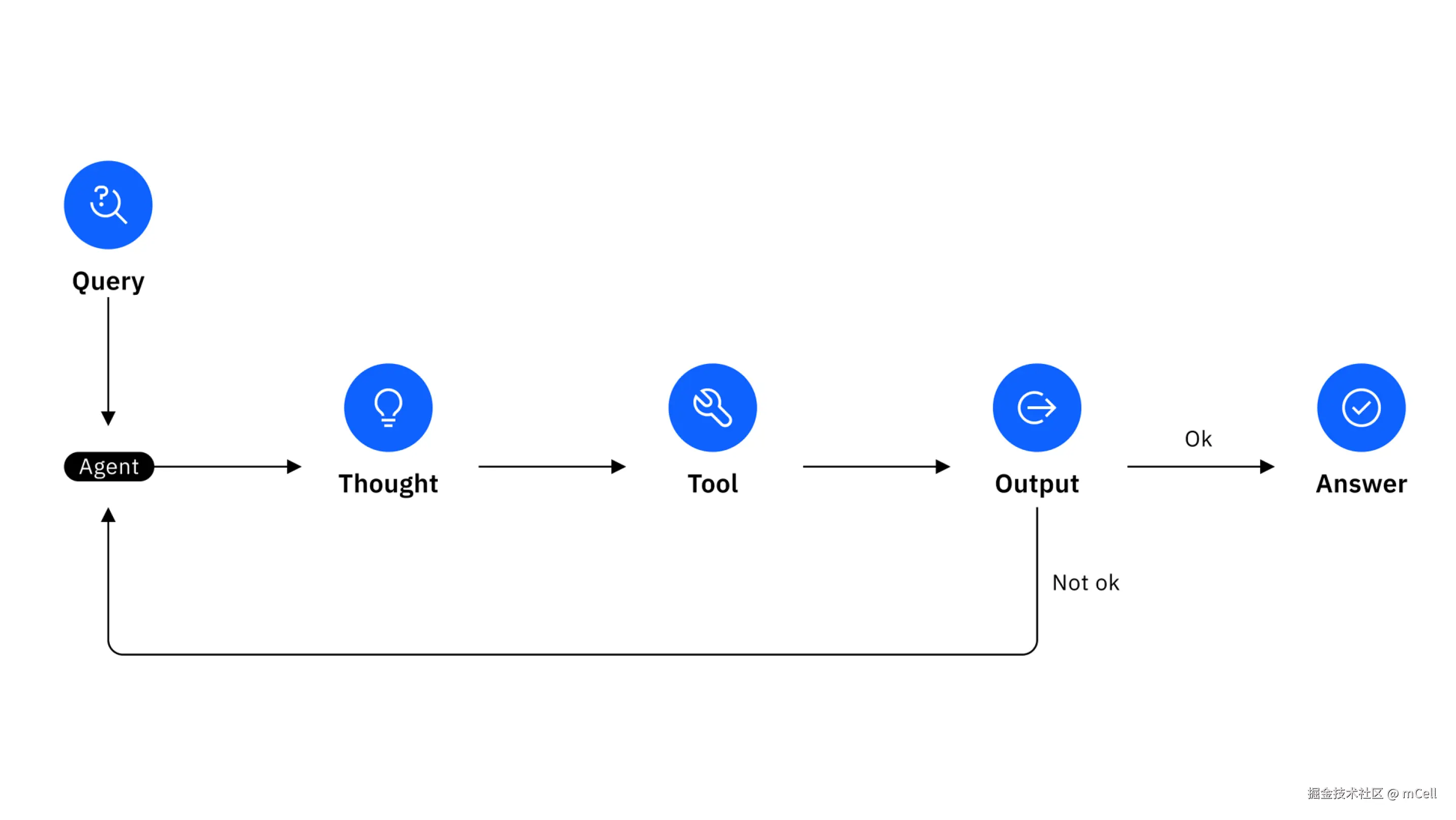 完成"行动"后,会得到一个新的"观察"(Observation),比如工具的返回结果。然后,Agent 带着这个新结果,回到第 1 步,再次"思考",形成一个循环。