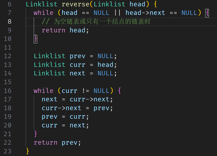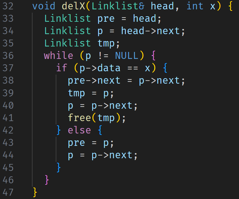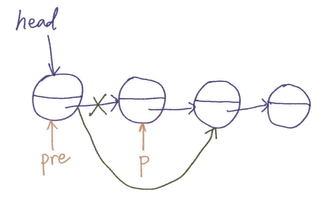 注:算法的关键是要记录当前结点p的前任pre,因为删除结点p需要p的前任连上p的后继;