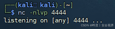 攻击者在本地终端2窗口执行以下命令,打开本地4444端口监听,等待回连的反向shell。