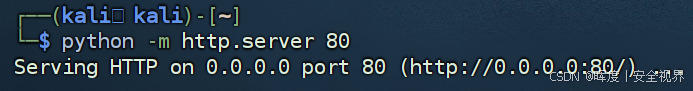 攻击者将powercat.ps1文件放置到当前工作目录(或指定目录),然后在本地终端1窗口执行以下命令启动简易 HTTP 服务器(默认监听 80 端口)。