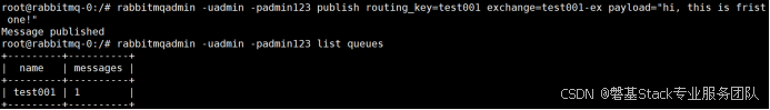 rabbitmqadmin -uadmin -padmin123 publish routing_key=test001 exchange=test001-ex payload="hi, this is frist one!"