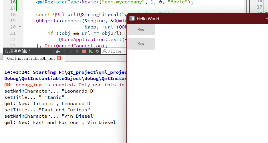 这里首先创建了一个Movie对象,因为title和mainCharacter已经实现做过属性设置,也就是Q_PROPERTY,所以可以直接当做属性来初始化。如果是其他成员变量是不行的哦。