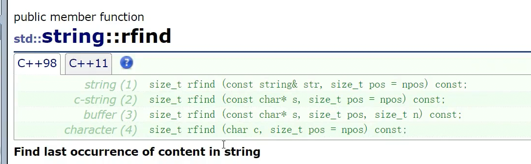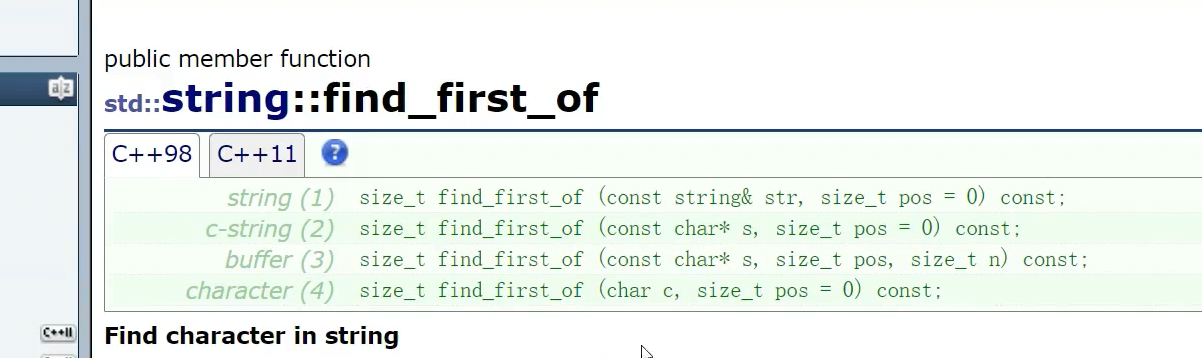 P 和它其中一个比对一下,相等就返回,不相等就继续比下一个,这的每一个字符都要比对一下,任意一个相等都返回, 此接口用的不多。find last of 倒着找