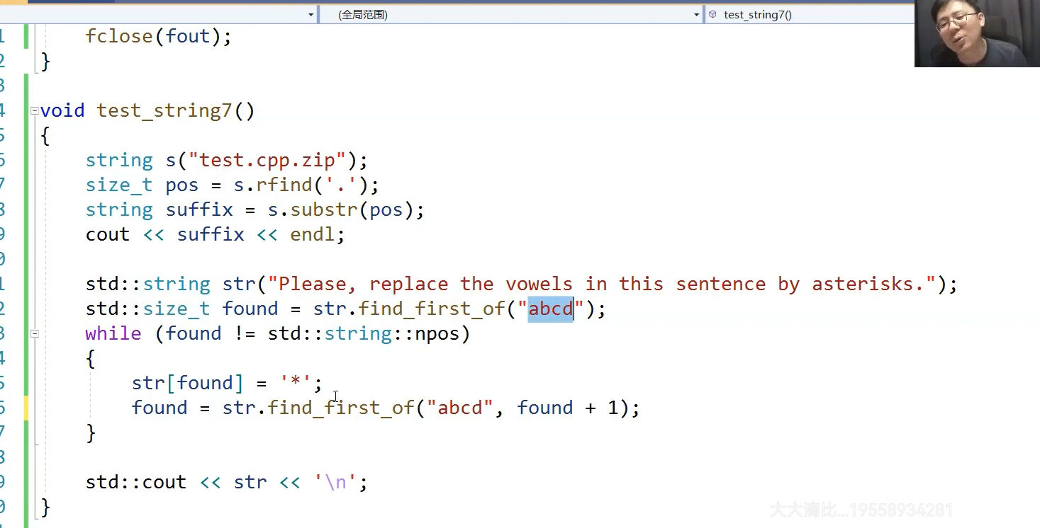 查找任意字符,假设把abcd全部替换成*,屏蔽掉, 用 find first of