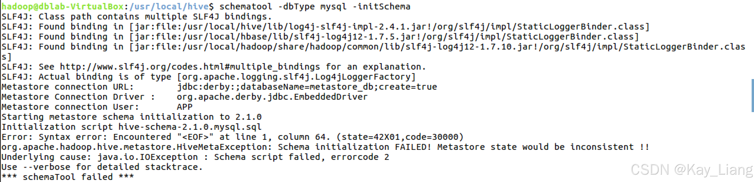 使用hive命令想要打开hive服务的时候无法打开,执行 schematool 初始化命令时,日志始终显示连接 Derby(而非配置的 MySQL),报错 "Schema initialization FAILED":
