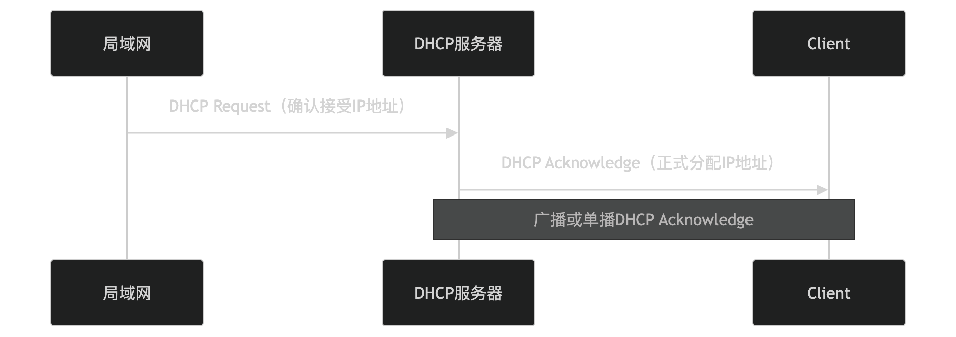DHCP 服务器收到 DHCP Request 包后,会发送一个 DHCP 确认包,正式分配 IP 地址和其他配置信息。
