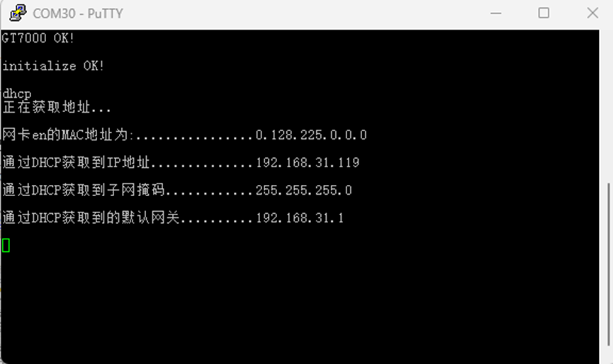 我们需要一根网线将GT7000的网口与路由器的网口连接,然后运行程序在putty串口工具输入"dhcp"进行自动分配IP。如下图所示